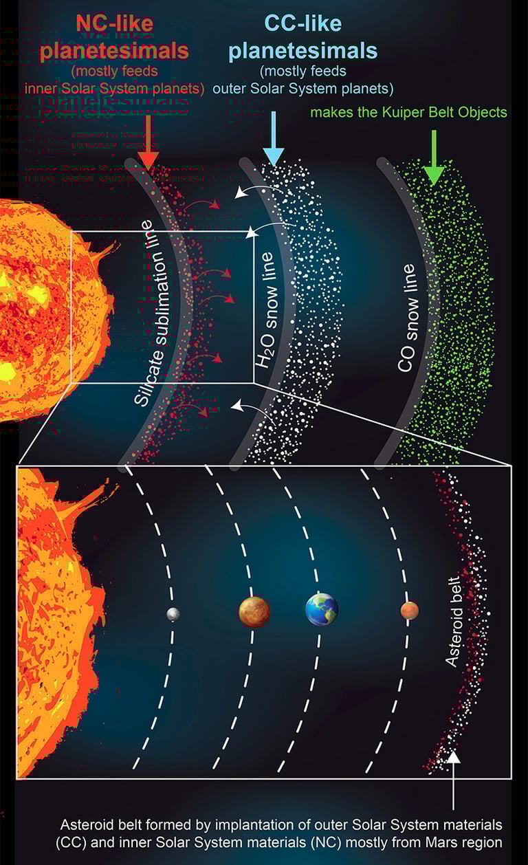 Water condensed as ice beyond the water snowline, the location in the Sun’s natal gaseous disk where temperatures were below 170 K. As the disk evolved and cooled, the snowline moved inwards. A low temperature in the terrestrial planet-forming region is unlikely to be the origin of water on the planets, and the distinct isotopic compositions of planetary objects formed in the inner and outer disks suggest limited early mixing of inner and outer Solar System materials. Water in our terrestrial planets has rather been derived from H-bearing materials indigenous to the inner disk and delivered by water-rich planetesimals formed beyond the snowline and scattered inwards during the growth, migration, and dynamical evolution of the giant planets.